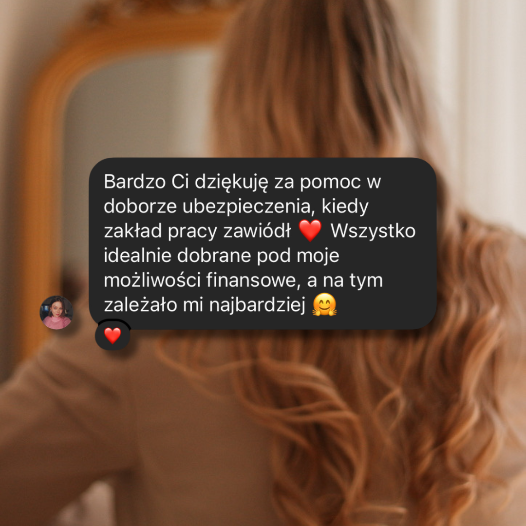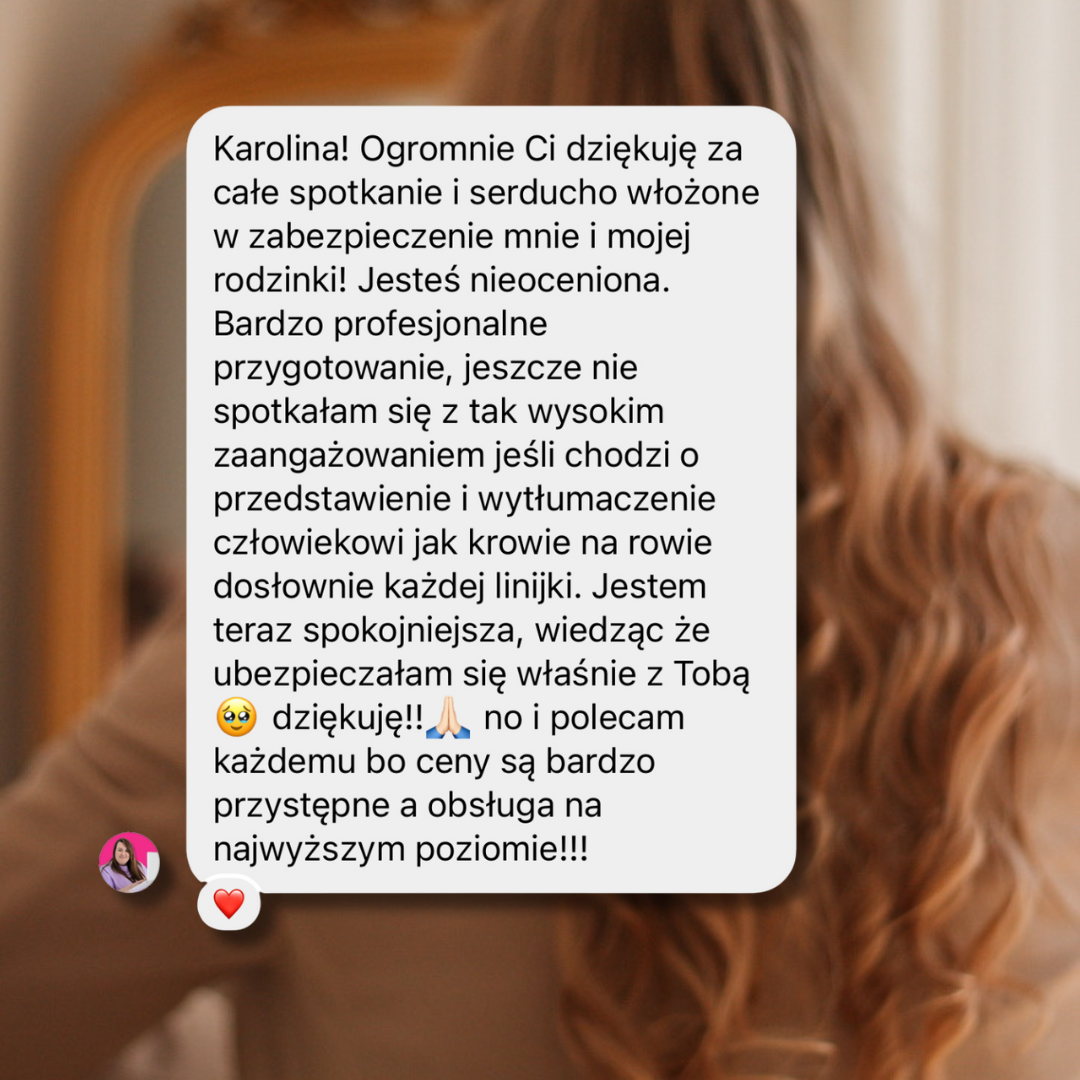 Wtedy niestety większość towarzystw nie przyjmie Cię już do ochrony i odroczy wniosek do zakończenia leczenia. W zależności od Twojego stanu zdrowotnego, albo zostaniesz przyjęta w późniejszym czasie, albo ubezpieczenie się nie będzie w ogóle możliwe. Dlatego najlepszy moment, by zadbać o polisę, to wtedy, gdy wszystko jest dobrze – właśnie po to, żeby w trudnych chwilach mieć wsparcie, a nie stres, że już nic nie możesz zrobić.